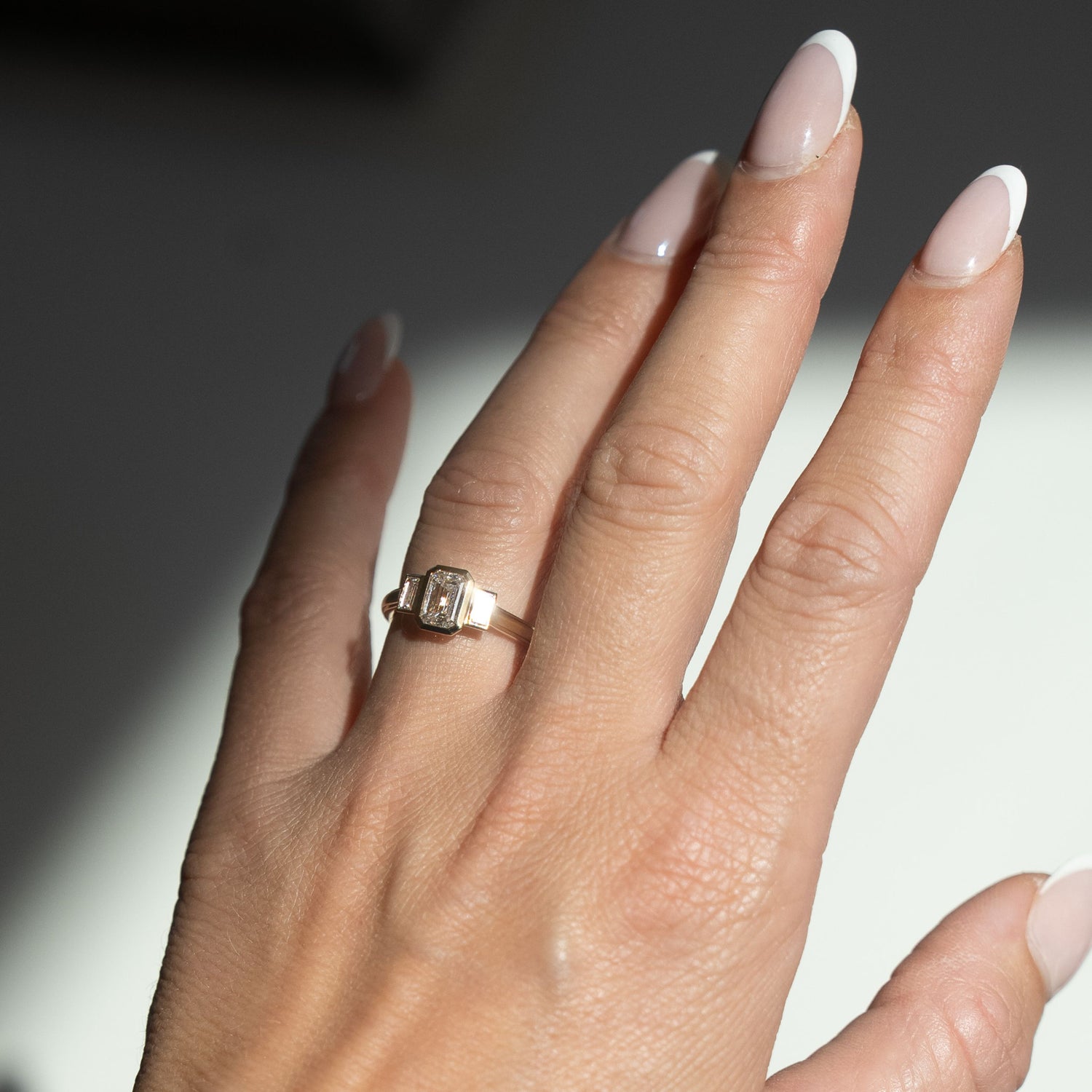 Ein außergewöhnlicher Three-Stone-Ring, der durch klare Linien und zeitlose Eleganz überzeugt. Der zentrale Emerald Cut Diamant mit 1,00 ct wird von zwei kleineren Emerald Cut Diamanten eingerahmt, die gemeinsam ein harmonisches, ausgewogenes Gesamtbild schaffen.