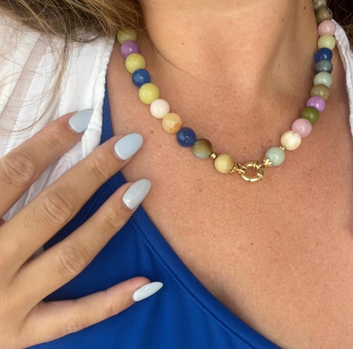 Unsere Statement-Kette kannst du selbstbewusst zu jedem Outfit kombinieren. Die Kette sticht mit ihren besonderen Edelsteinen und deren Farbeigenschaften sofort ins Auge!