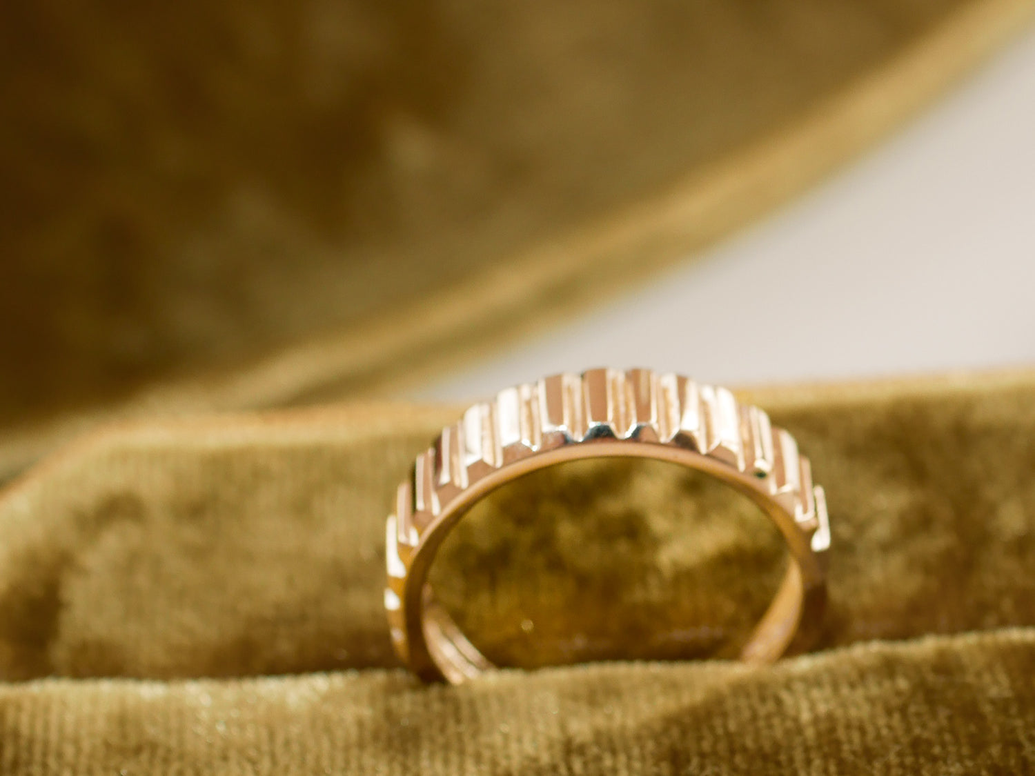 Ein Design mit Struktur und Charakter: Der Ring „Cleo“ ist eine moderne Hommage an klassische Goldschmiedekunst und verbindet klare Linien mit einer markanten Oberflächenstruktur. Die feinen, rhythmischen Riffelungen verleihen dem Ring Tiefe, Lichtreflexe und eine außergewöhnliche Haptik: ein Detail, das ihn unverwechselbar macht.