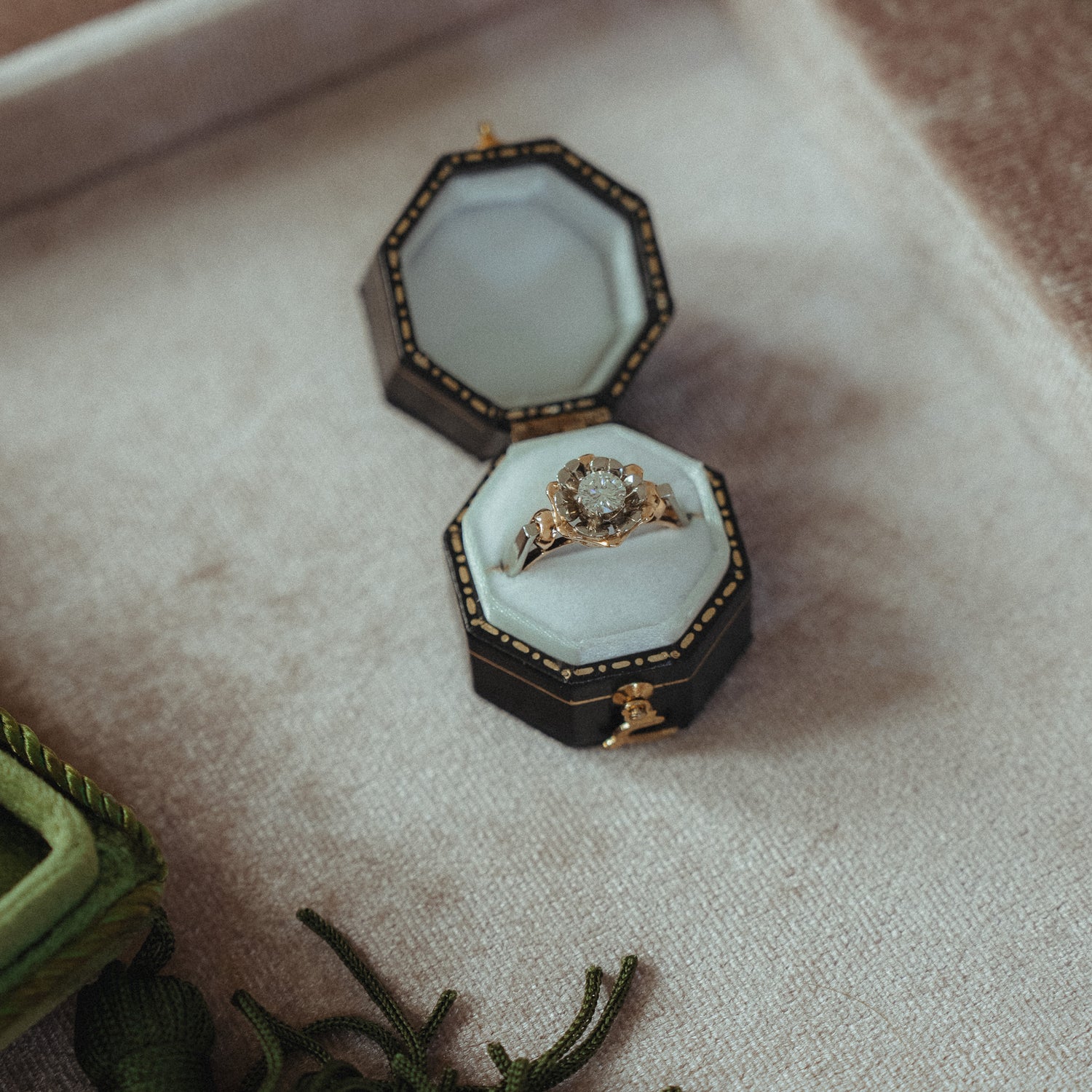 Steinbesatz: Natürlicher Diamant im Zentrum, umrahmt von floralen Elementen im Vintage-Stil