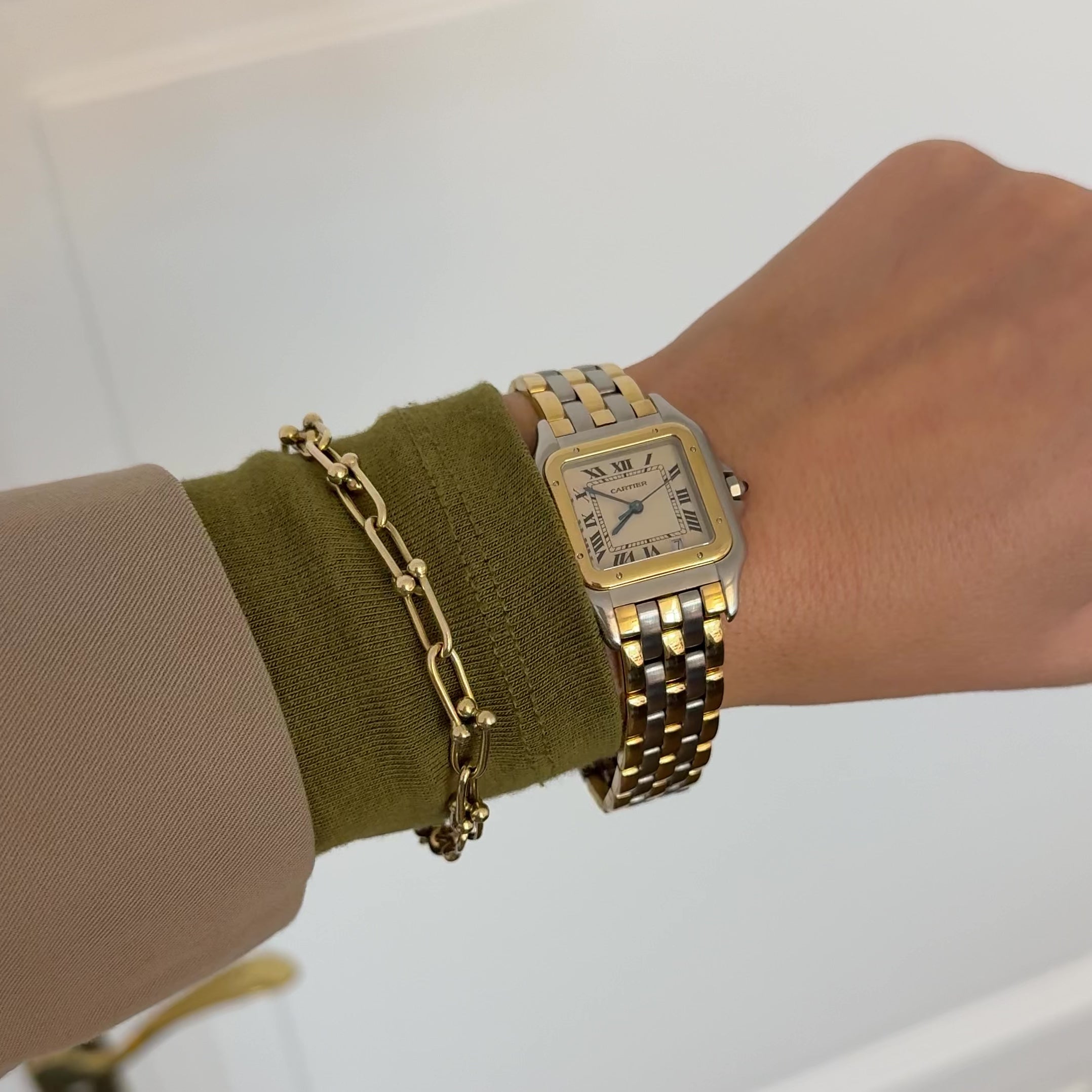 Das charakteristische dreireihige Armband aus Edelstahl und 18kt Gelbgold verleiht der Uhr eine harmonische Balance zwischen Glanz und Alltagstauglichkeit. Im Vergleich zur bekannteren 2-Liner-Variante gilt die 3-Liner-Version als seltener und besonders elegant – sie wirkt etwas kraftvoller, bleibt dabei aber unverkennbar feminin.